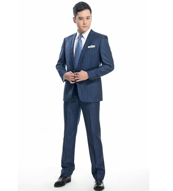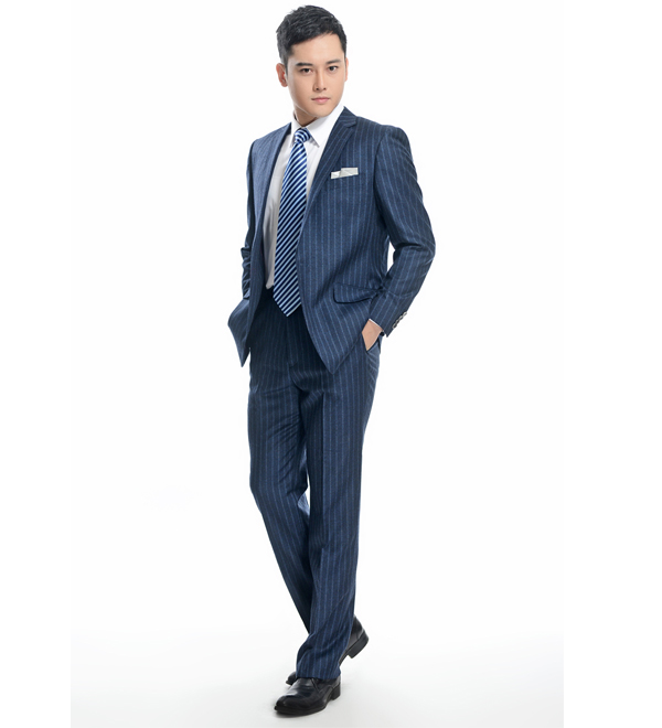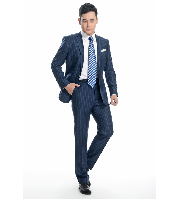 藍(lán)色條紋職業(yè)套裝,給人一種大海的清涼感覺。同時(shí)面料又是采用高檔純毛面料,